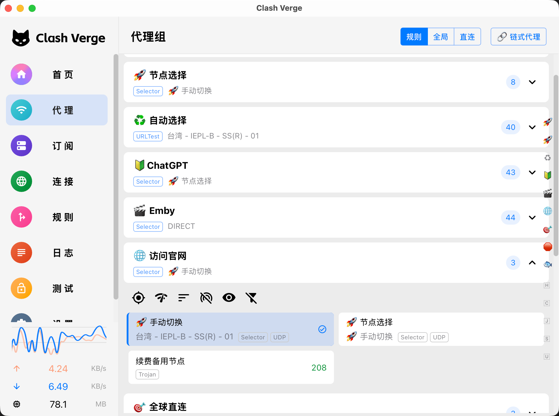因为官网默认不允许境内访问,为了解决用户可能会失联的问题,我们提供了专属节点可以来访问官网,因为节点特殊性,默认只提供在Clash订阅的软件中,如下图所示,切换为续费备用节点,即可使用该节点访问官网,该节点做了处理只提供访问官网的请求。