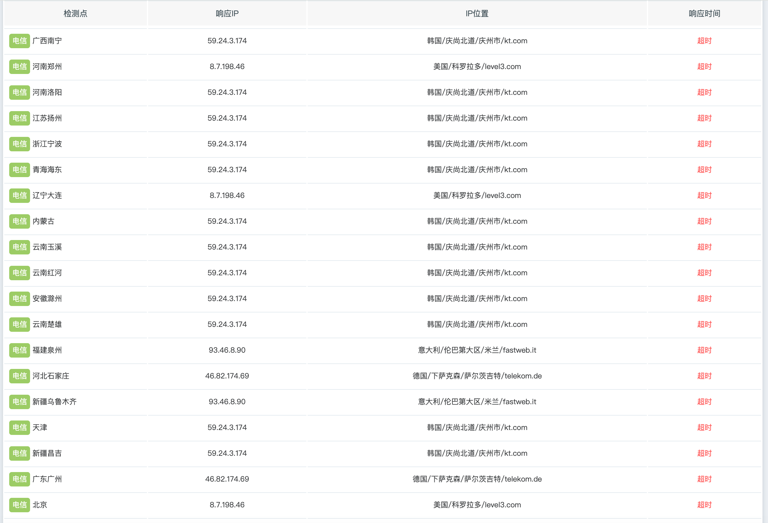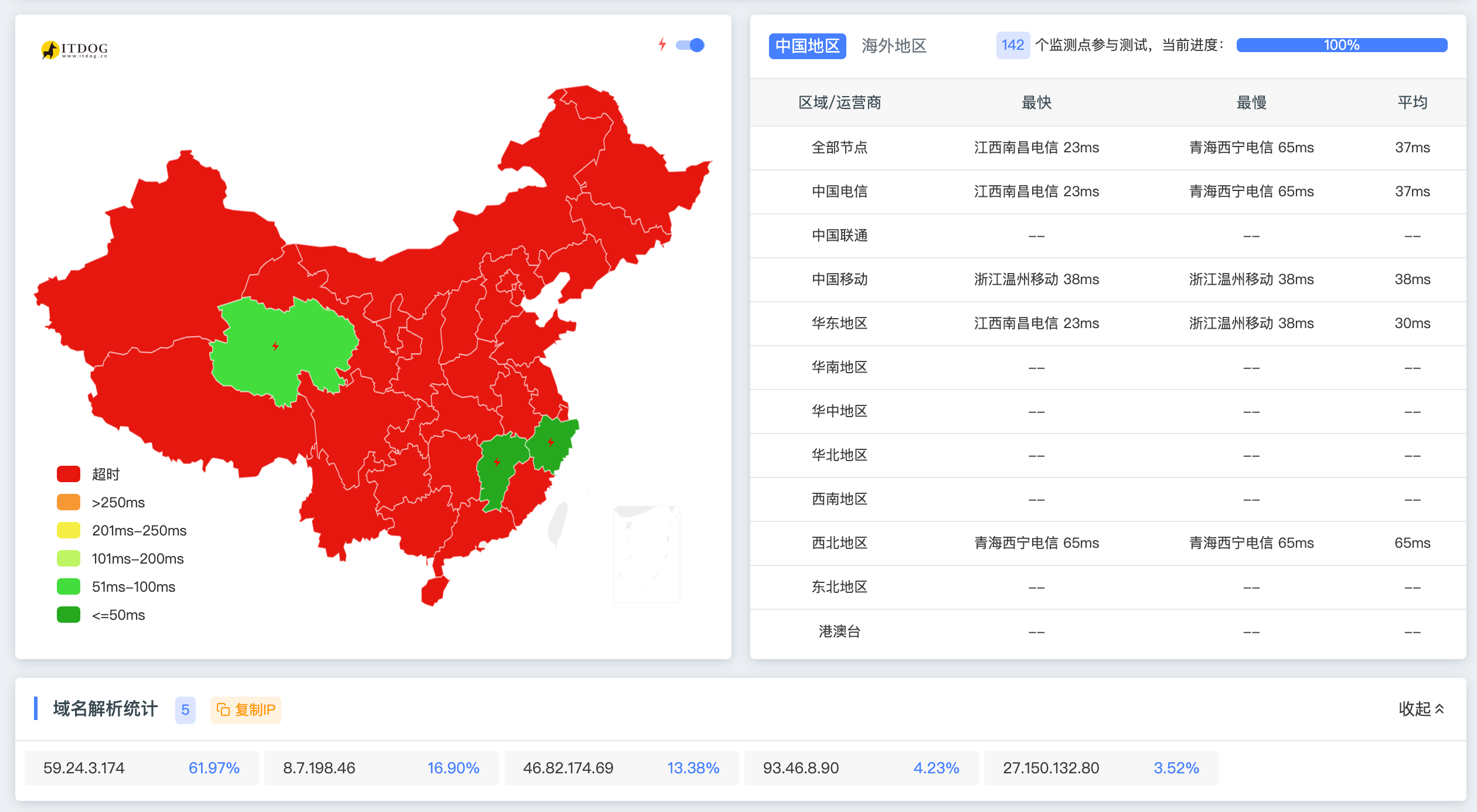 首先打开 https://www.itdog.cn/ping 这个网站,在输入框输入节点信息中的节点地址,点击单次测试。如果DNS污染了该域名,那么国内解析的应该都是坏的,你就可以点击港澳台、海外这里的响应IP就是真实的连接地址,使用真实的IP去更换代理软件内的节点地址可以临时连接节点。